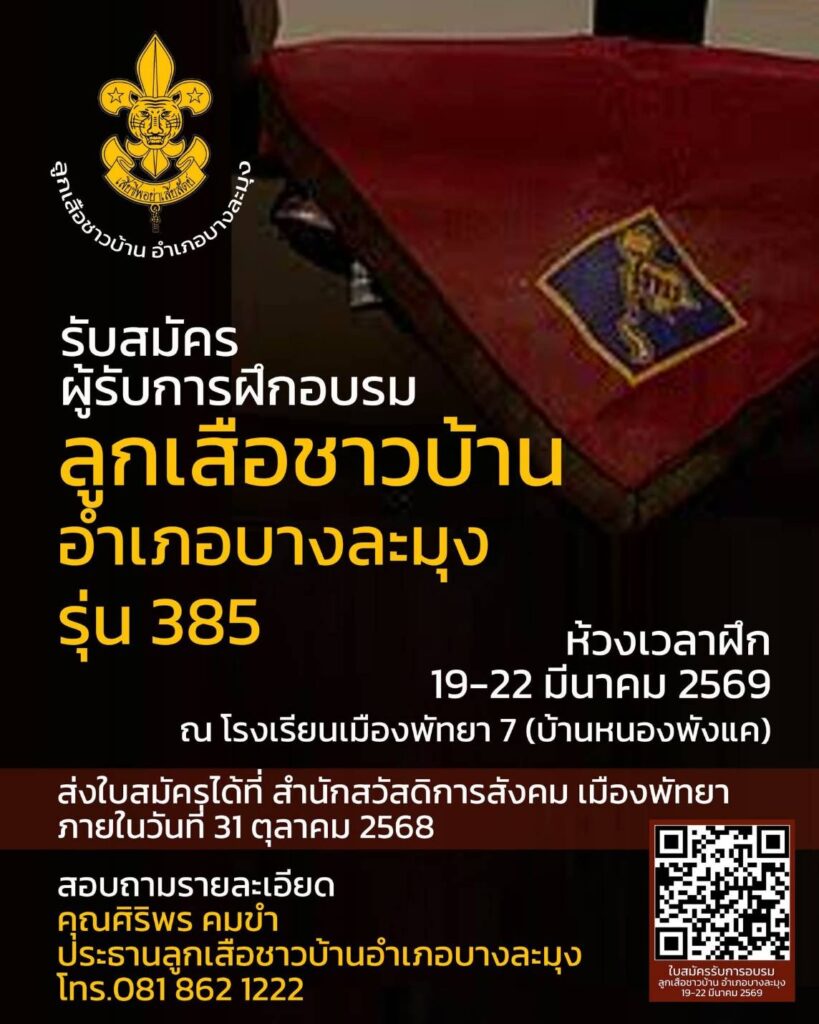 ส่งใบสมัครได้ที่ สำนักงานสวัสดิการสังคม เมืองพัทยา ภายในวันที่ ๓๑ ตุลาคม ๒๕๖๘ สอบถามลายละเอียดเพิ่มเติม คุณศิริพร คมขำ ประธานชมรมลูกเสือชาวบ้านอำเภอบางละมุง โทร.๐๘-๑๘๖๒-๑๒๔๒